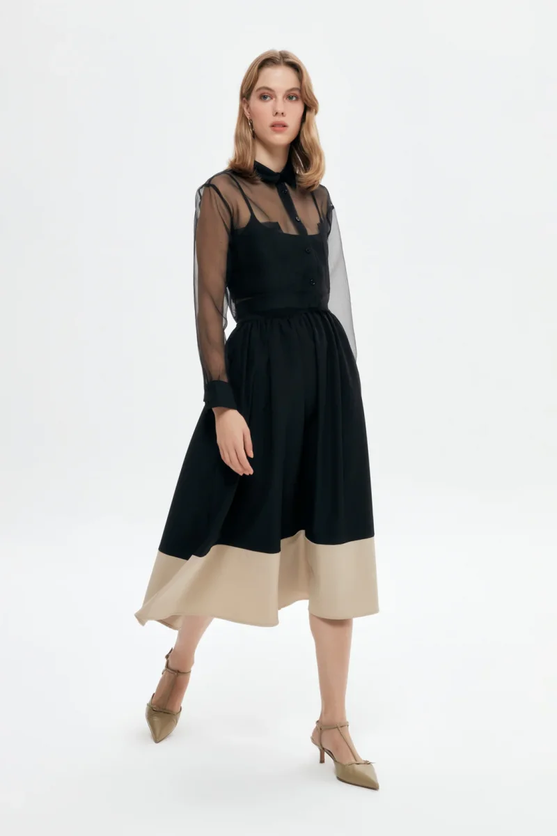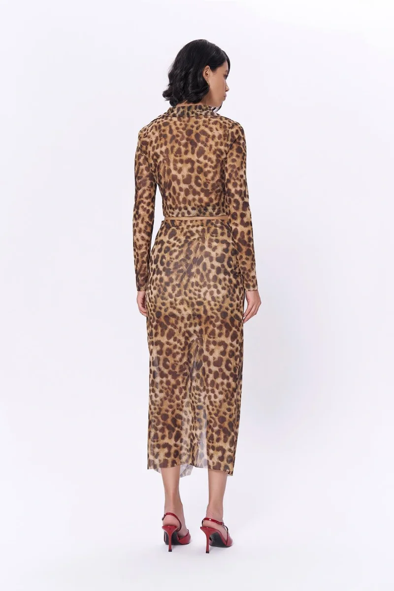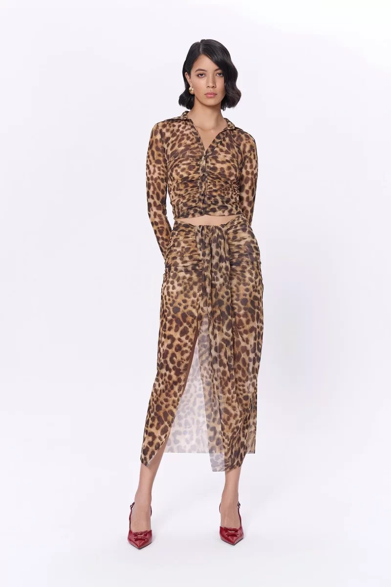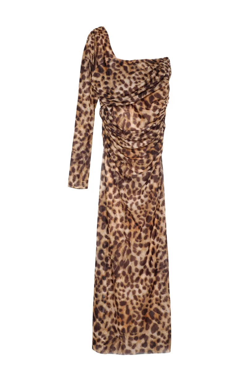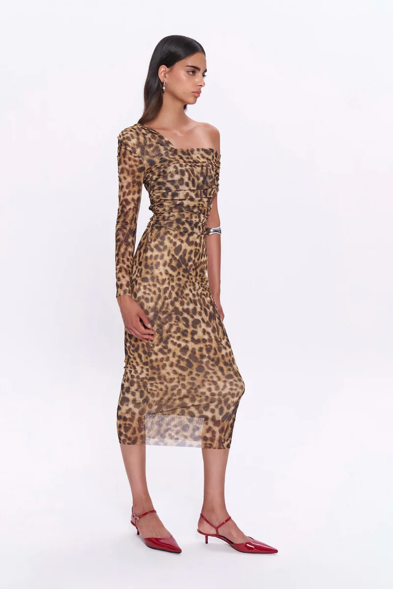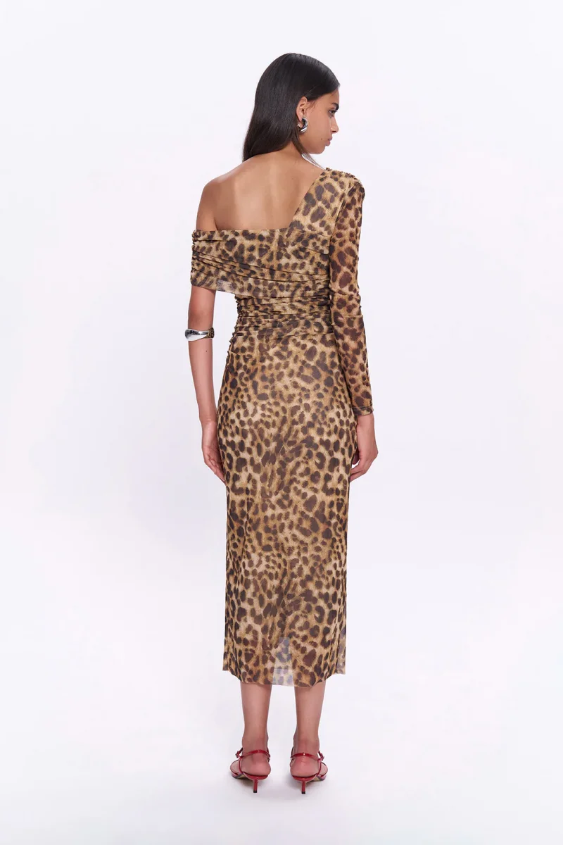 Leopar Desenli Drape Detaylı Tül Midi Elbise Kahverengi