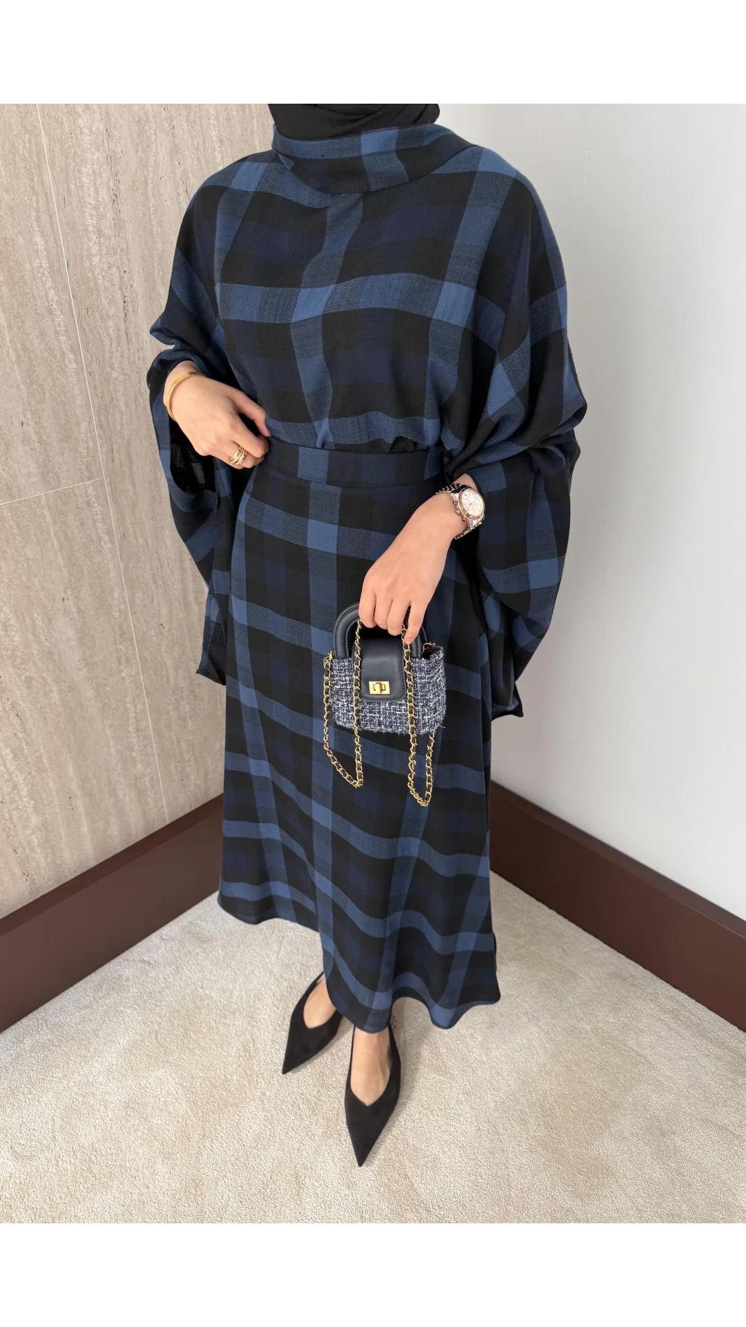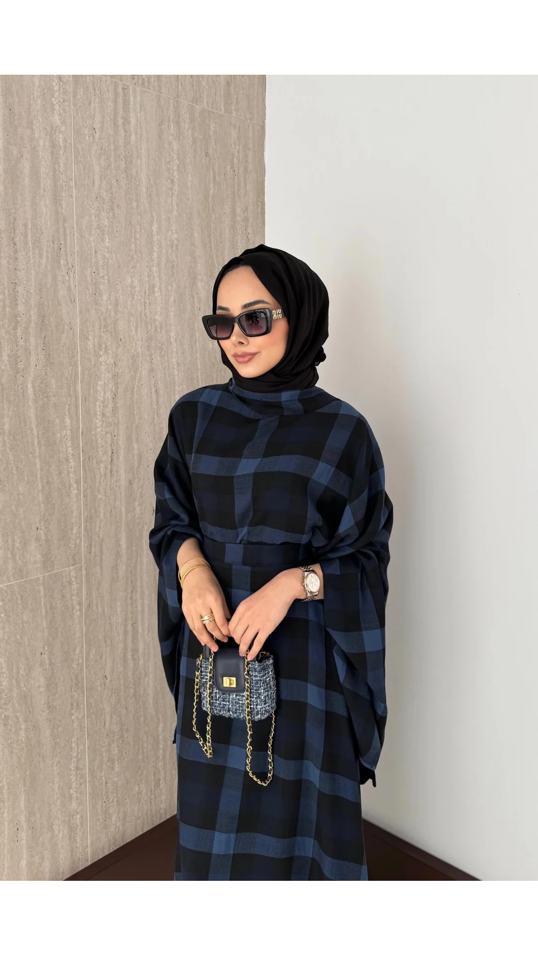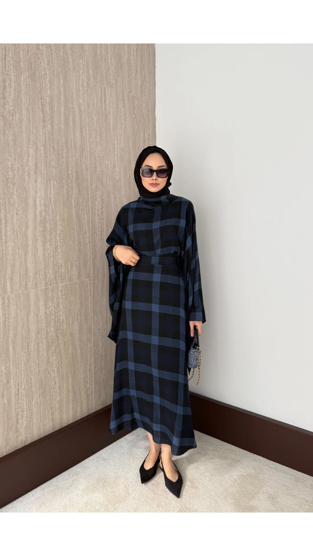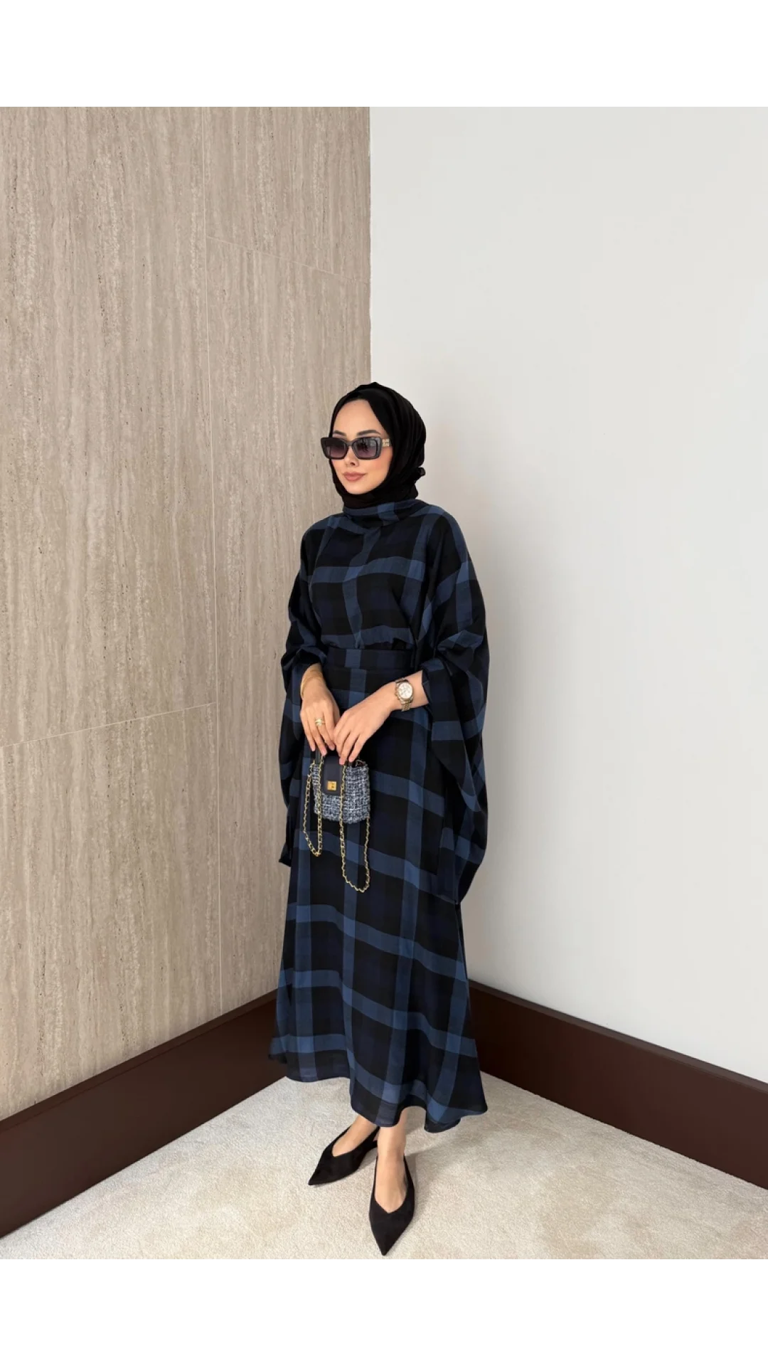 Üst : Bisiklet yaka, arkadan fermuarlı, yarasa kollu, fular bağlamalı, oversize kesime sahiptir.