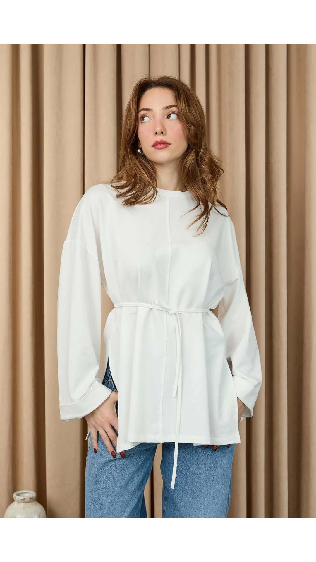 Kadın Düşük Omuz Detaylı Bağlama Aksesuarlı Bluz Ekru