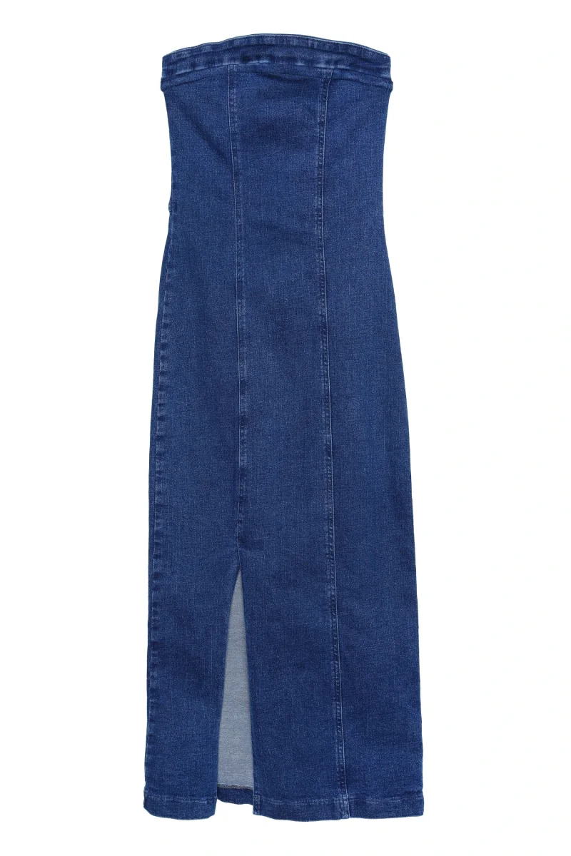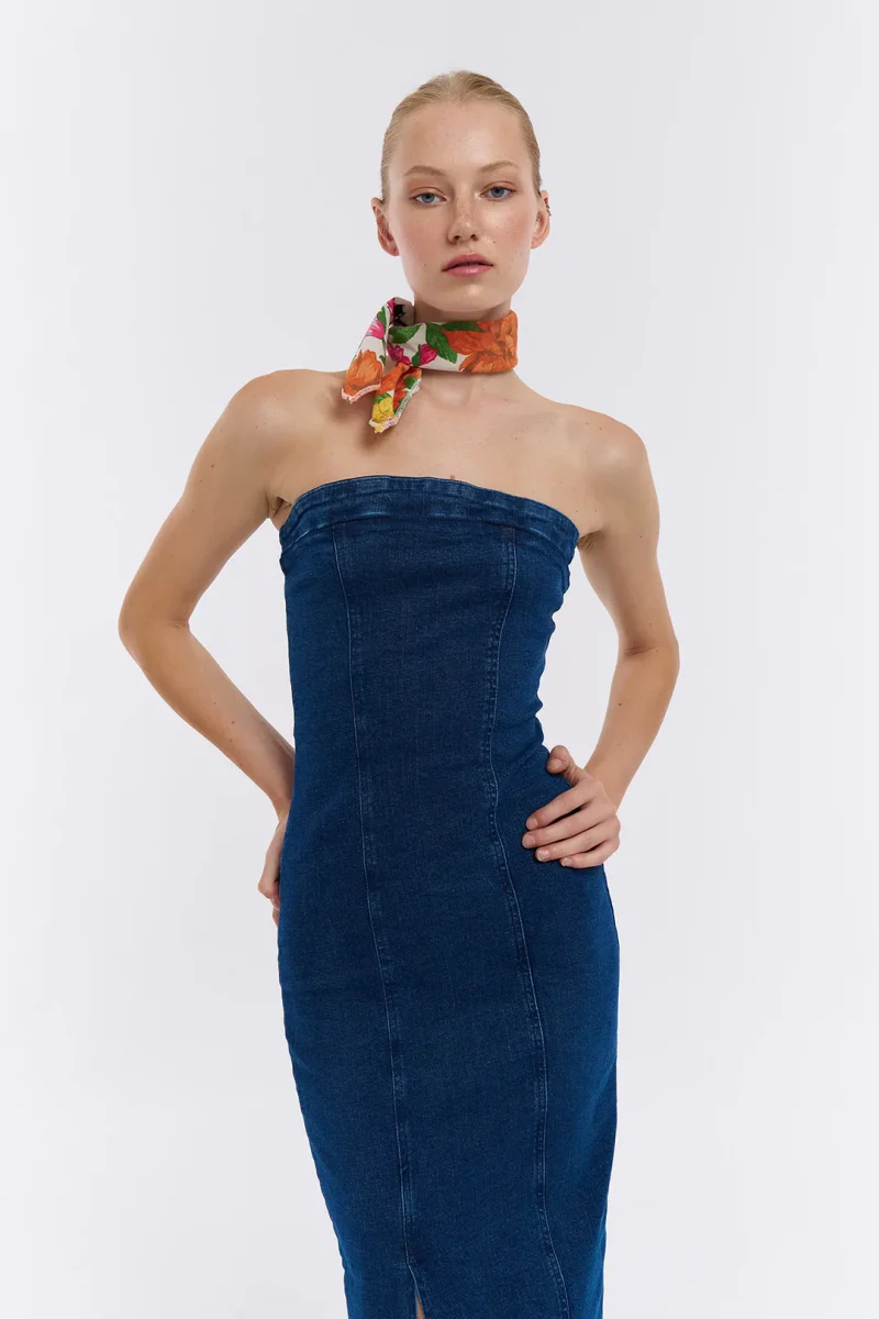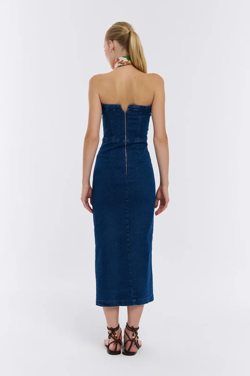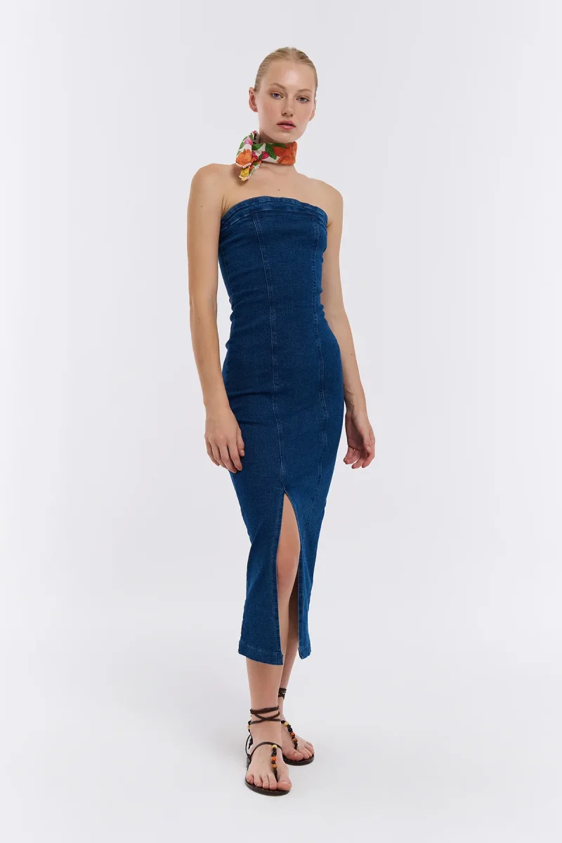 Straplez Detaylı Önden Yırtmaçlı Midi Kot Elbise Mavi